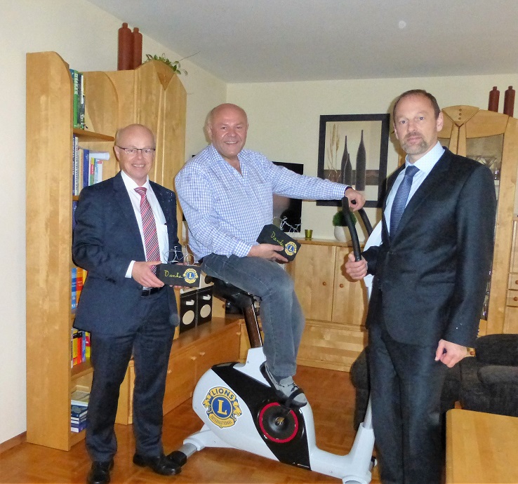 Für die neue Aktion des LIONS-Clubs Bayerwald mit Sitz in Cham „LIONS bewegen sich und andere für den guten Zweck“ trat diesmal der prominenteste Standesbeamte Furth im Walds und bekannte Kabarettist Toni Lauerer an. Der leidenschaftliche Radfahrer stieg für den LIONS-Club, der vor allem unverschuldet in Not geratene und bedürftige Menschen im Landkreis Cham unterstützt, in die Pedale des von Sport Wanninger zur Verfügung gestellten Trimmrads und radelte zu Hause in seiner guten Stube respektable 305 Minuten, die Sparkassendirektor Franz Wittmann mit 1.525 Euro honorierte, d.h. 5 Euro für jede Minute.